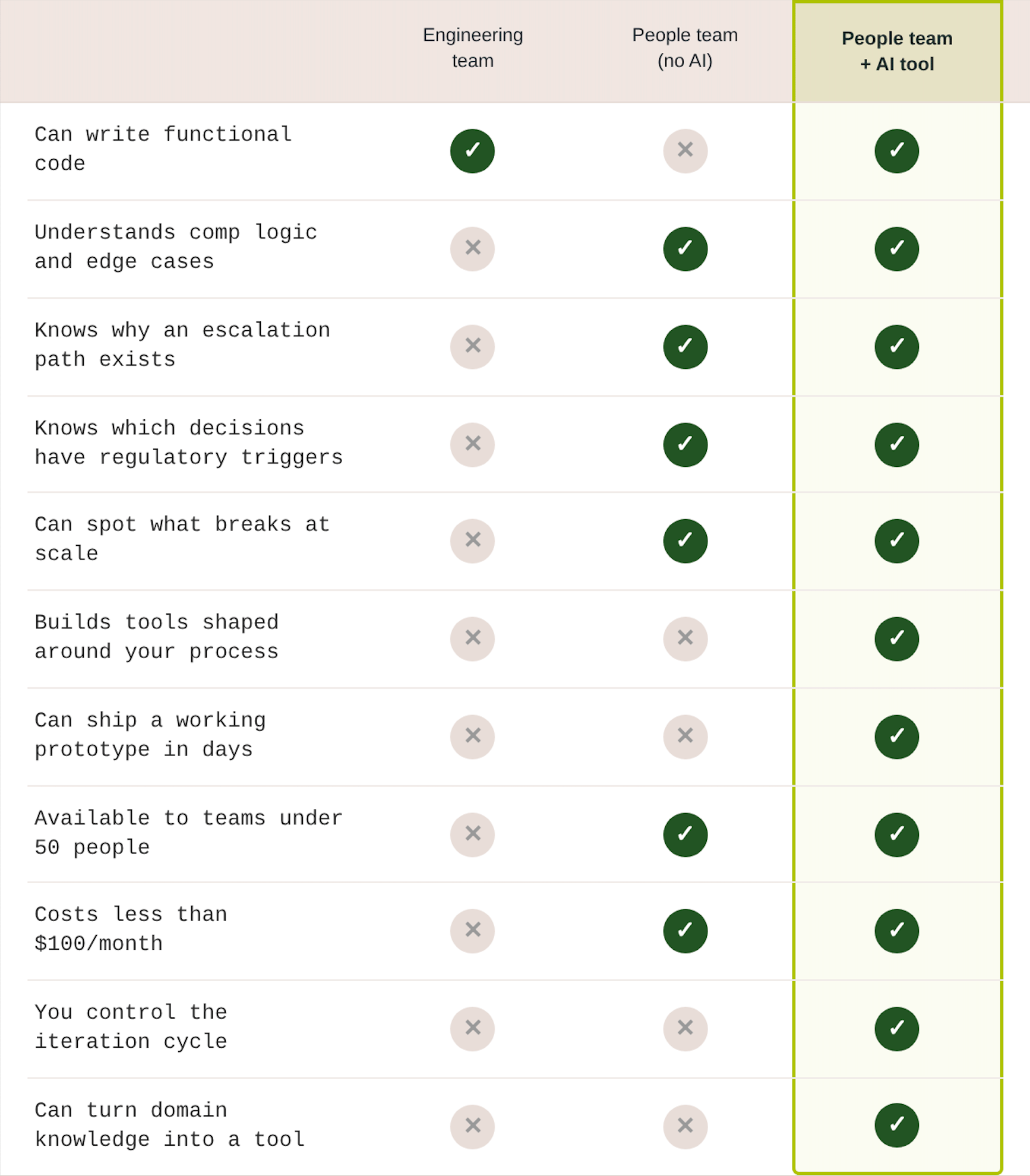 Five years ago, if you wanted custom tooling for your comp processes, you had two options. Buy enterprise software and bend your workflows to fit it. Or have a dedicated engineering team build something from scratch. Option one is expensive and rigid. Option two was only available to companies like Meta and Google, who could afford to throw engineers at HR problems.